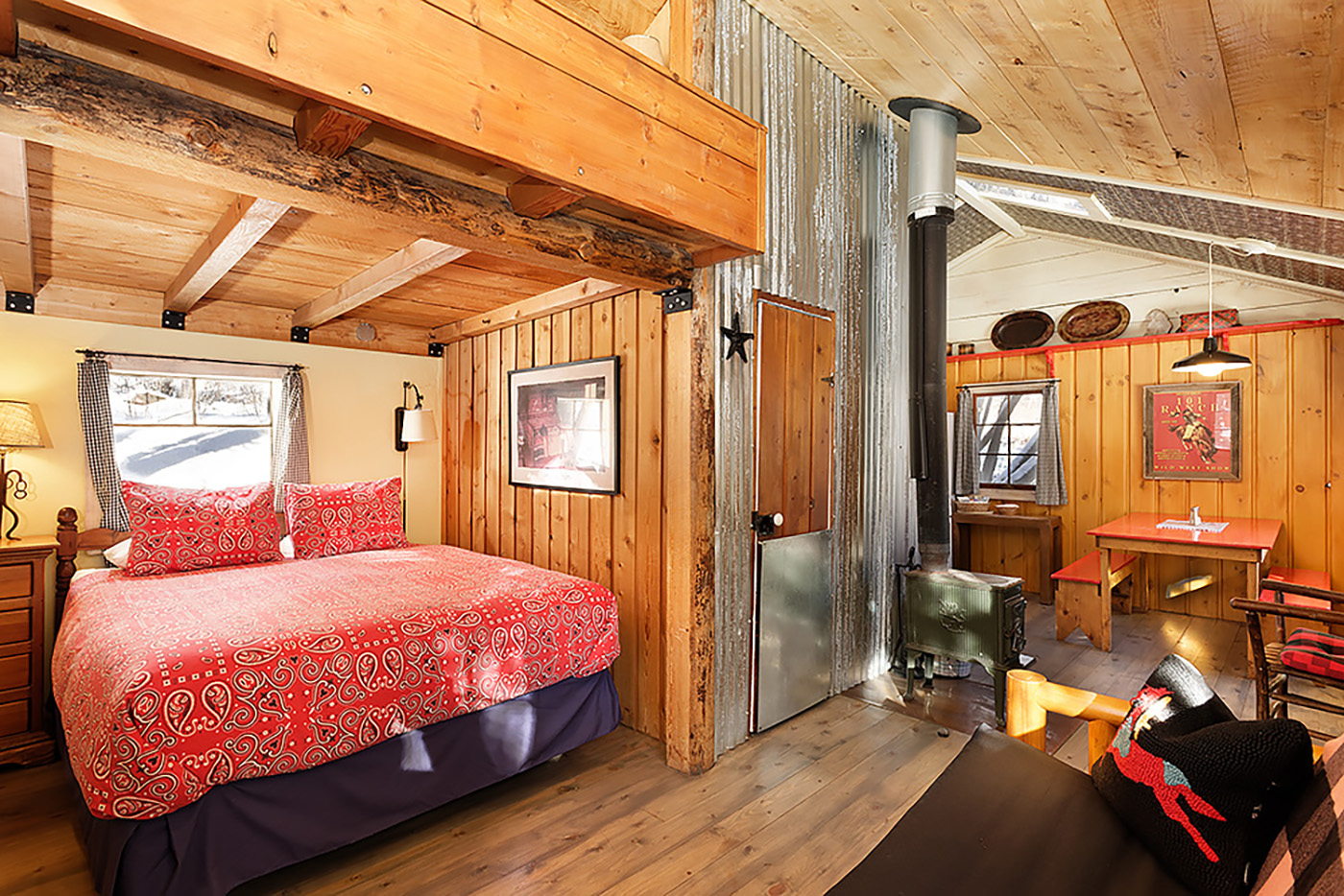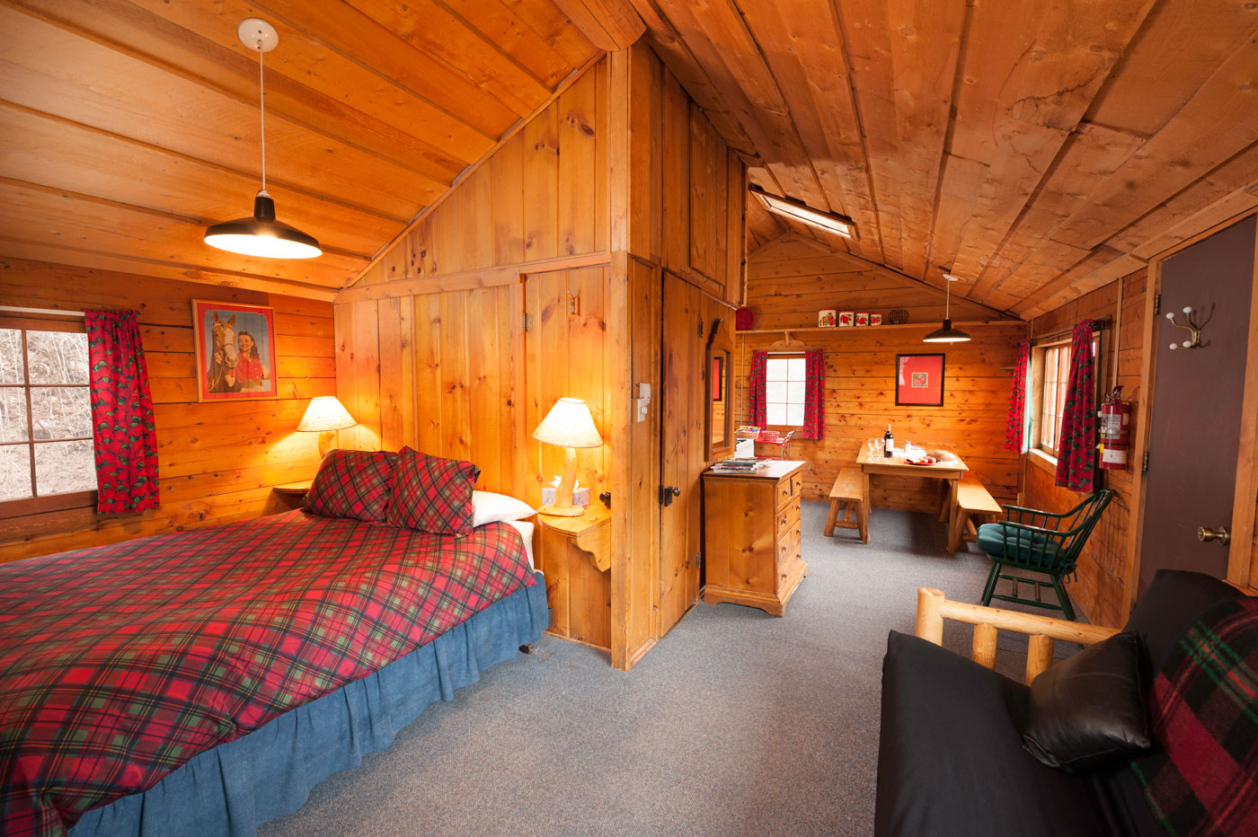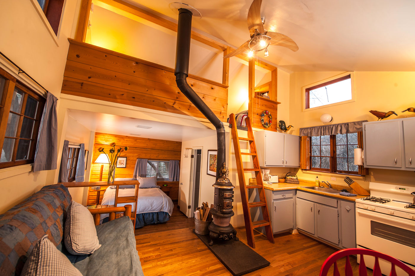 Studio with loft, tub/shower, queen bed, full futon, full mattress in loft, complete kitchen.